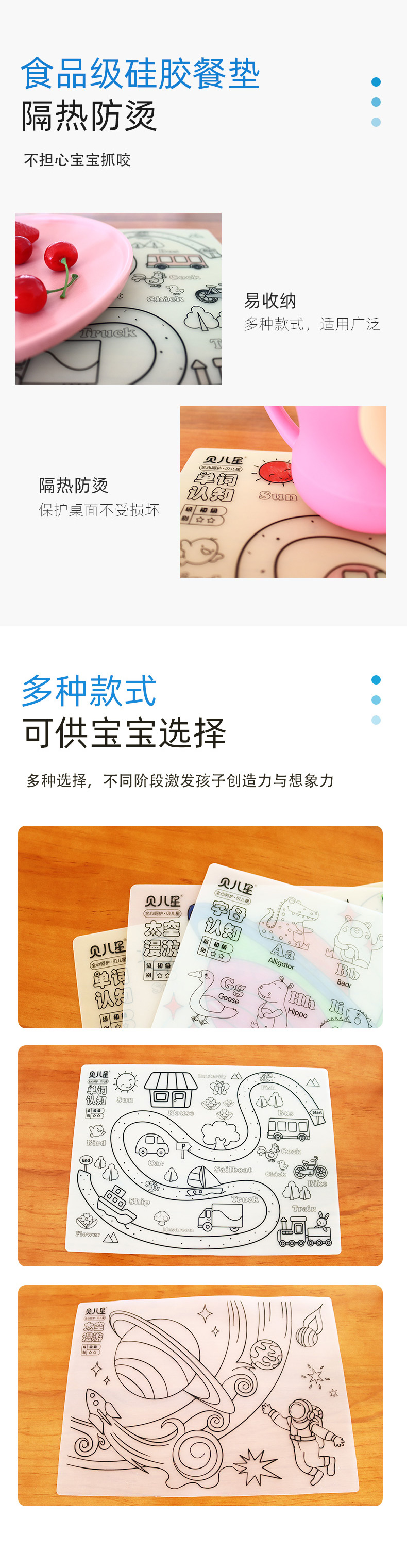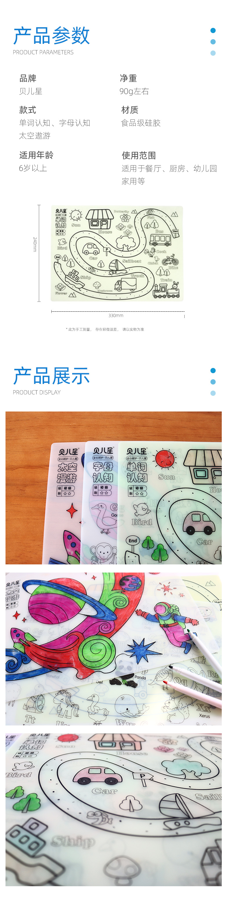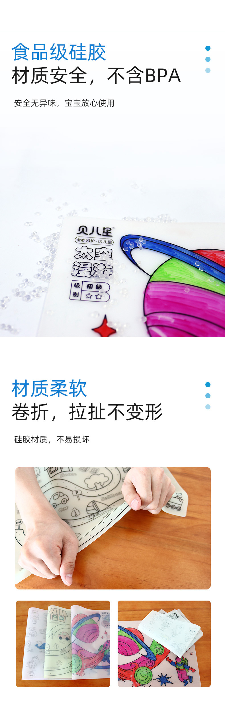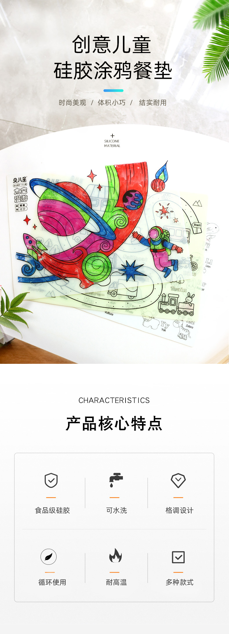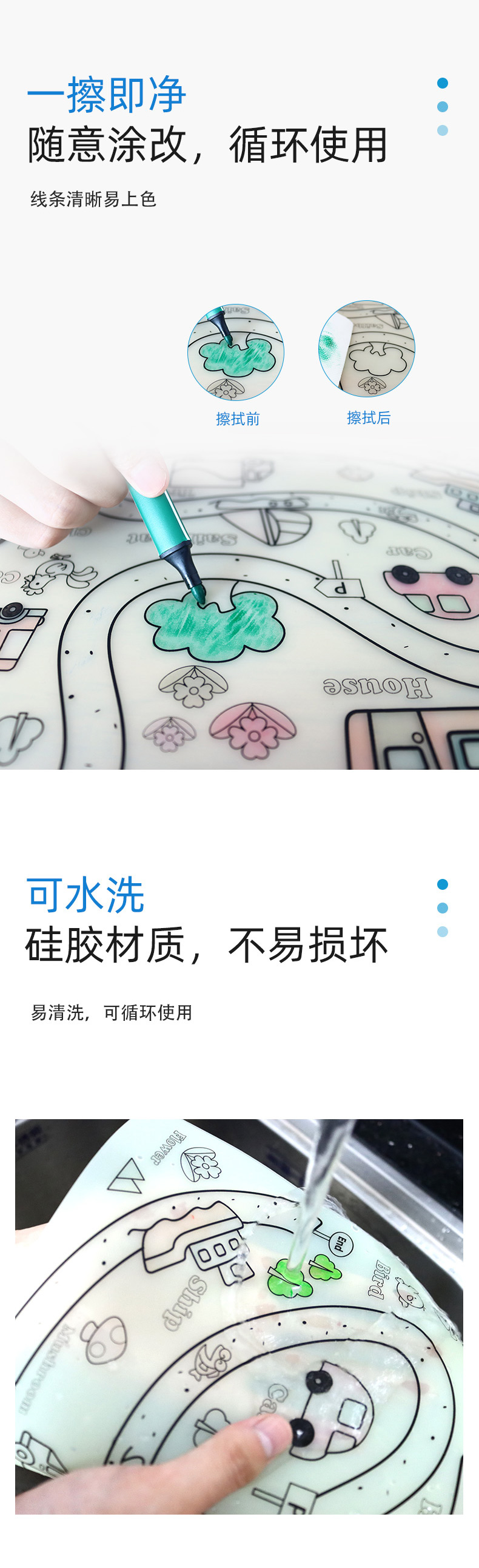 硅膠涂鴉畫板產(chǎn)品的主要買點(diǎn)源于產(chǎn)品的表面圖案以及配套的創(chuàng)意,產(chǎn)品從6-12歲之間具有不同的主題與認(rèn)知圖案,可以連接整體進(jìn)行學(xué)習(xí)提升大腦開發(fā),加強(qiáng)兒童動(dòng)手能力以及創(chuàng)新創(chuàng)作能力,此外產(chǎn)品配比水性可清洗彩色筆,不會(huì)對(duì)硅膠表面產(chǎn)生筆污以及筆畫痕跡,材料屬于柔軟回彈食品級(jí)硅膠,所以硅膠店鋪可以任意曲折來(lái)回折疊不會(huì)變形損壞,此外硅膠墊片可水性可隔熱,可耐高低溫,可以在多個(gè)行業(yè)領(lǐng)域當(dāng)中運(yùn)用!